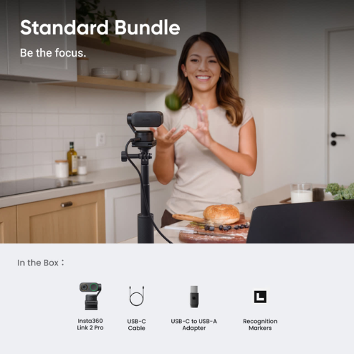 - Standard Bundle includes 1x Insta360 Link 2 Pro, 1x Magnetic Mount, 4x Recognition Markers, 1x USB-C Cable and 1x USB-C to USB-A Adapter.